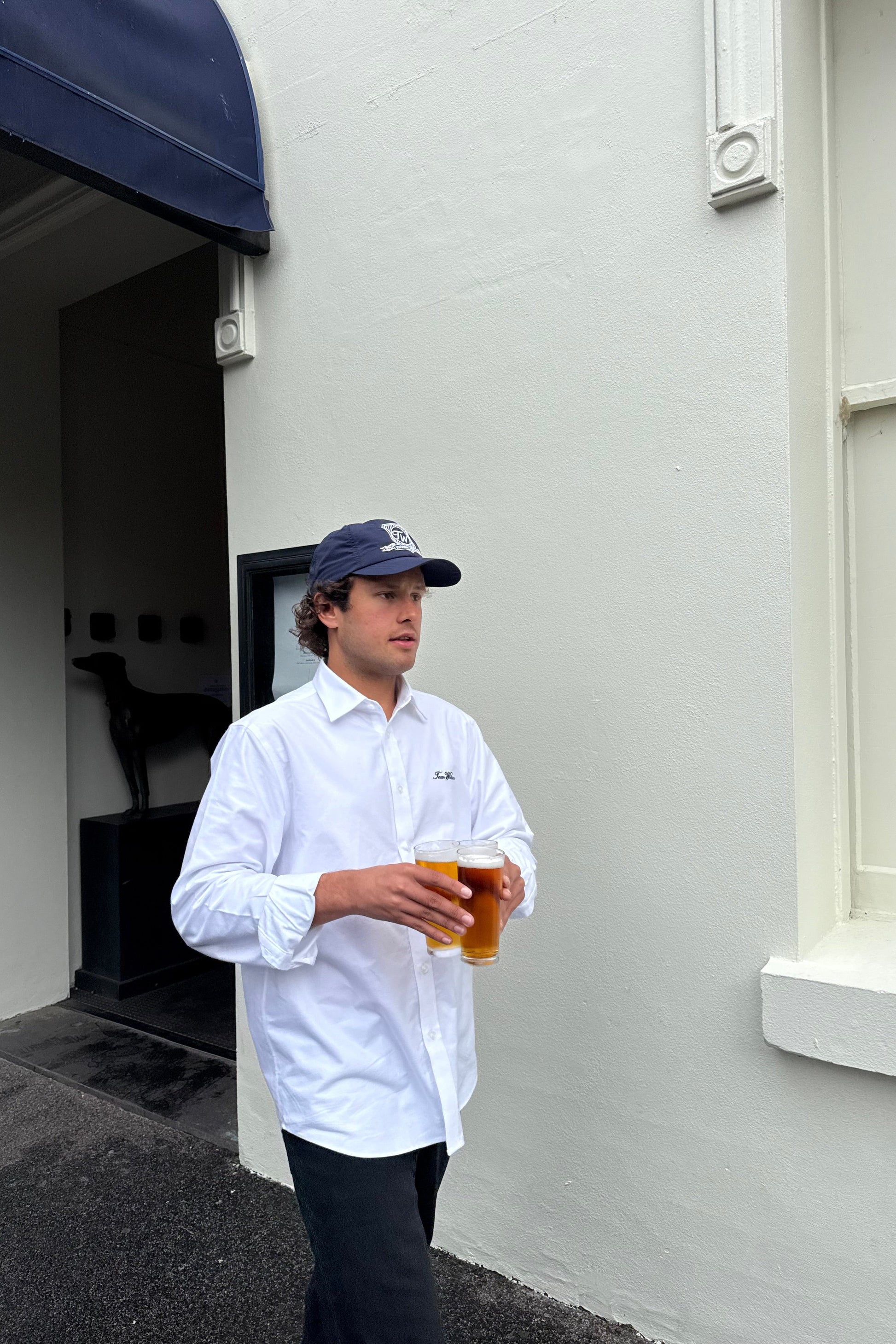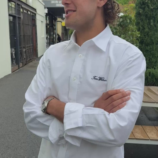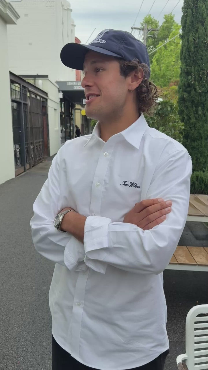 Our dress shirt is made from classic oxford cotton for a comfortable, timeless feel. Finished with our signature navy embroidery, it’s an ideal choice for workdays or evenings out, whether worn on its own or styled open as an overshirt with a tee or singlet underneath.